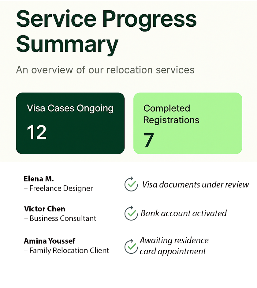 1. Personalized pathway plan (timeline + document roadmap) 2. Banking appointment support (requirements clarified + prep) 3. Housing & lease guidance (checklist + sample clauses/templates) 4. Translation & appointment coordination (via vetted partners; availability varies) 5. Tax & compliance roadmap (accountant deliverables/f filings not included)